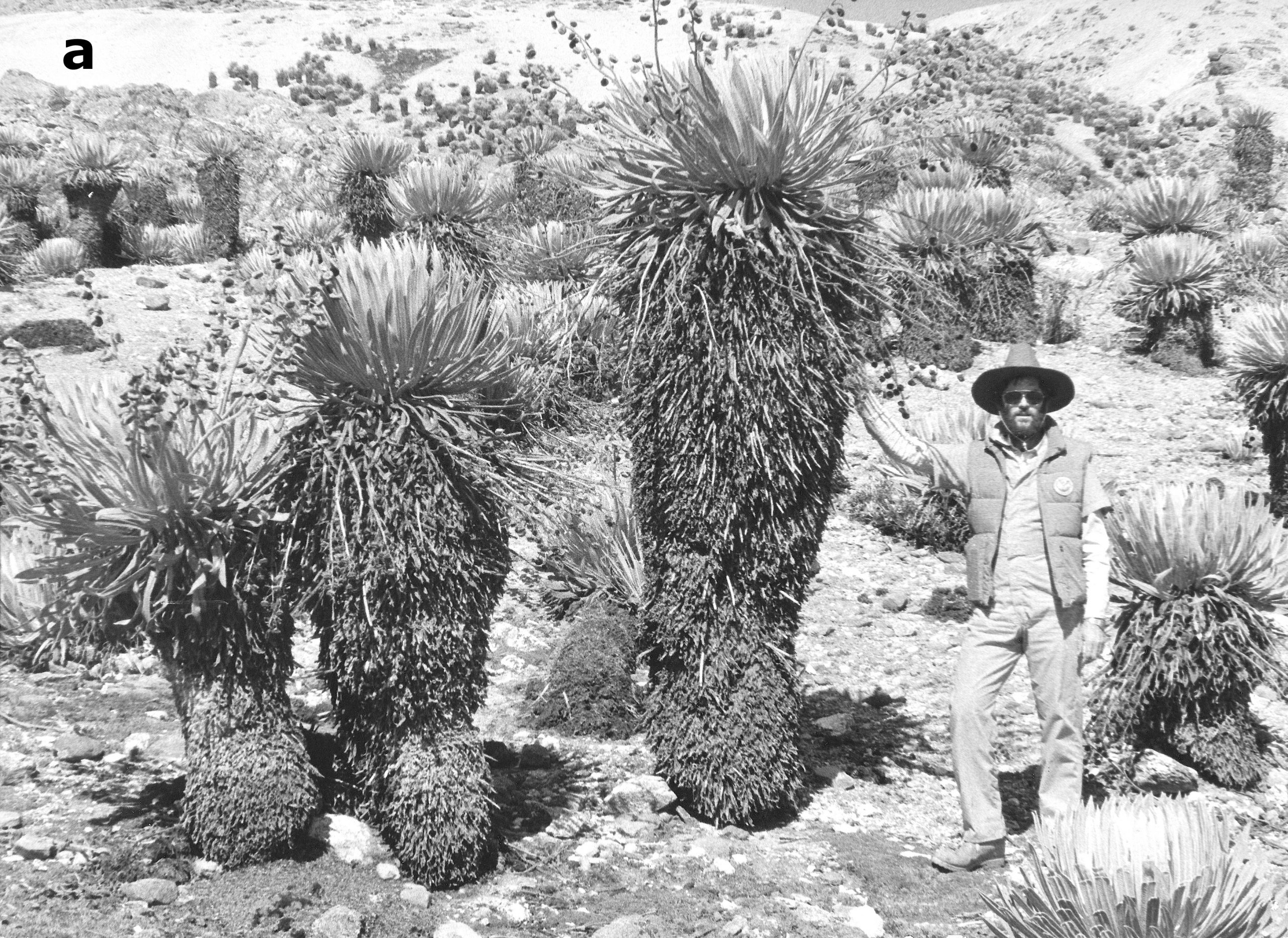 Tall stem-rosettes — aka giant rosettes — grow at high elevations on many tropical mountains, including the northern Andes of South America, the East African highlands, and the large volcanoes of the Hawaiian and the Canary Islands. In contrast to trees, the woody trunks of these plants do not generate annual growth rings, thus their age cannot be readily determined; instead, variation in stem height has routinely been used as a proxy for estimating plant age. Elongation rates have been measured for several stem-rosette species during the past 50 years; average growth rates, determined for small populations or groups of stem-rosettes, have then been used to calculate plant age. Difficult access to the mountain areas where these plants grow, and various logistic reasons, have restricted most growth studies to short time periods, often for less than one to just a few years.