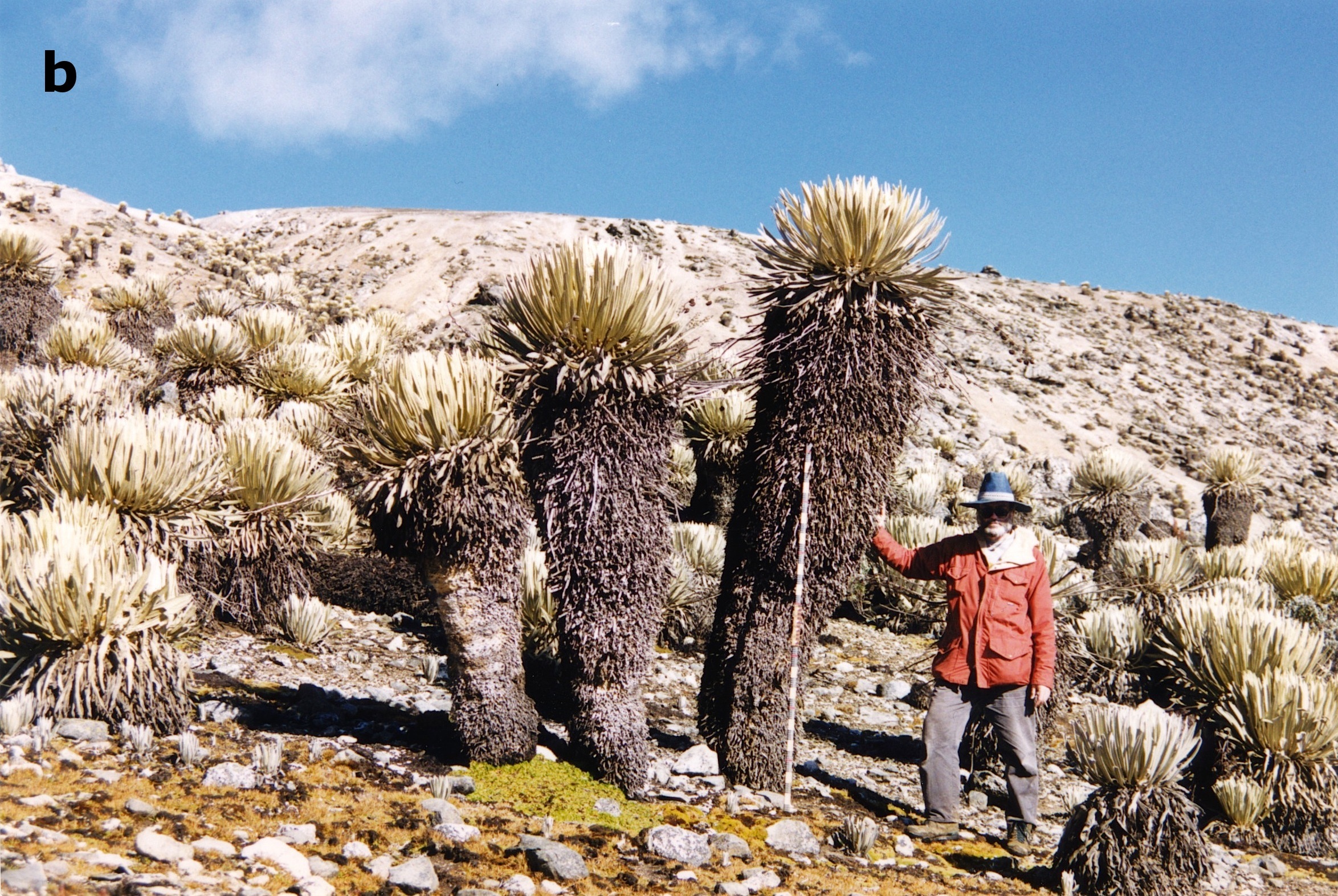 These photos show a group of C. timotensis at ~4385 m; the one on the right is one of the tallest rosettes I ever found in Piedras Blancas. On Jan. 10, 1982, height to its uppermost leaf tip was 291±2 cm (photo a); on Feb. 29, 2000, after an 18-yr, ~2-mo period, it had grown 21 cm to 312±2 cm (photo b). Using a specific growth rate of ~1.16 cm/yr (see discussion, below) would yield a presumed age of ~269 years for this plant; of course, this would assume, probably incorrectly, a uniform growth rate during this plant’s life. The second tallest rosette to the left seems to have grown even more (~28 cm, ~1.54 cm/yr) during the same time interval; scale is 180 cm-long.