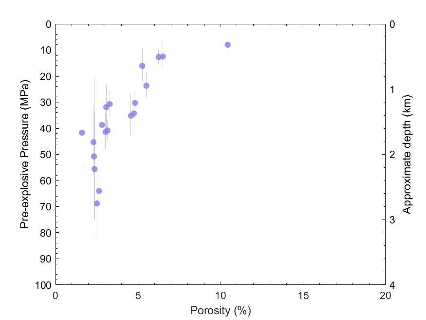 Researchers4 first estimated some conduit parameters from the analysis of pumices, i.e. samples from the pre-explosive magma column that were expelled from the conduit during the explosive event. On each sample, glass (i.e. not crystalized magma) water content, a good indicator of magma pressure, was measured using an elementary analyzer. The porosity was also measured with Scanning Electron Microscopy and 3D imaging of the sampled pumices. From these constraining parameters, conduit pressure5 and depth6 retrieval models were used to estimate pre-explosive porosity, pressure, depth, and water solubility conditions in the conduit. Results show that prior to the explosion, the magmatic column was extensively degassed (few bubbles = low porosity) and that the explosion ejected samples from the magma column down to at least 3km in the conduit (Figure 2).